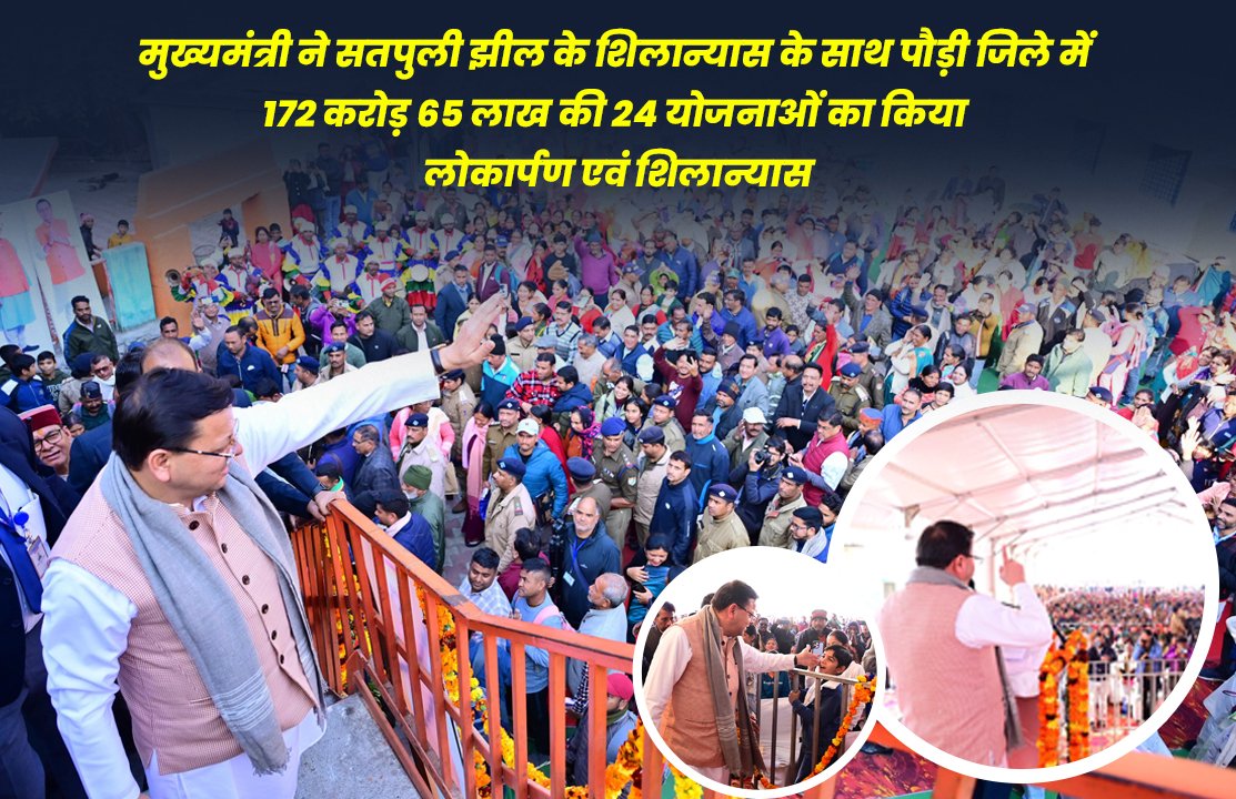 मुख्यमंत्री पुष्कर सिंह धामी ने गुरुवार को पौड़ी जिले के सतपुली में आयोजित कार्यक्रम में पूर्वी नयार नदी में बनने वाली बहुउद्देशीय सतपुली झील का शिलान्यास किया। साथ ही लगभग 172 करोड़ 65 लाख की विभिन्न विकास योजनाओं का लोकार्पण और शिलान्यास भी किया गया। इन योजनाओं में 123 करोड़ 53 लाख की 04 योजनाओं का शिलान्यास और 49 करोड़ 12 लाख की 20 योजनाओं का लोकार्पण शामिल हैं।