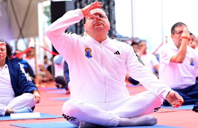भराड़ीसैंण, गैरसैंण। मुख्यमंत्री पुष्कर सिंह धामी ने शनिवार को भराड़ीसैंण स्थित विधानसभा परिसर में 11वें अंतरराष्ट्रीय योग दिवस के अवसर पर आयोजित भव्य योग कार्यक्रम में हिस्सा लिया। इस अवसर पर उन्होंने योग गुरु पद्मश्री स्वामी भारत भूषण और आठ देशों के प्रतिनिधियों के साथ सामूहिक योगाभ्यास किया।