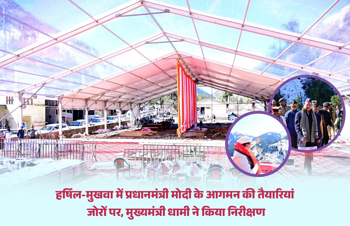 मुख्यमंत्री श्री पुष्कर सिंह धामी ने आज हर्षिल-मुखवा क्षेत्र का भ्रमण कर प्रधानमंत्री श्री नरेंद्र मोदी के प्रस्तावित दौरे को लेकर तैयारियों का स्थलीय निरीक्षण किया। मुख्यमंत्री ने इस दौरे को उत्तराखंड के शीतकालीन पर्यटन के लिए महत्वपूर्ण बताते हुए कहा कि इससे राज्य में पर्यटकों की संख्या में वृद्धि होगी और यह राज्य की समृद्धि में बड़ा योगदान देगा।