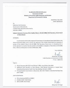 सरकार की ओर से जारी पत्र में स्पष्ट किया गया है कि राधा रतूड़ी को 1 अक्टूबर 2024 से 31 मार्च 2025 तक सेवा विस्तार प्रदान किया गया है। यह निर्णय उत्तराखंड की प्रशासनिक स्थिरता के लिए महत्वपूर्ण माना जा रहा है।