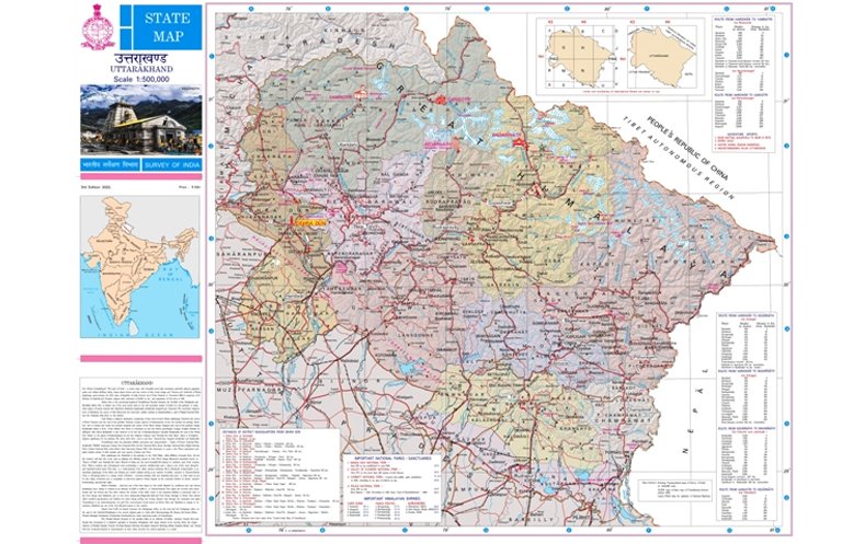 उत्तराखंड के लिए नक्शे के क्षेत्र में एक बड़ा और महत्वपूर्ण अपडेट सामने आया है। सर्वे ऑफ इंडिया ने राज्य के राज्य मानचित्र (स्टेट मैप) का तीसरा संस्करण जारी किया है, जो प्रदेश की सड़कों, मार्गों, प्रमुख स्थलों और भौगोलिक अवस्थिति की अद्यतन जानकारी प्रदान करता है। यह नक्शा 1:500,000 के स्केल पर आधारित है, जिसका अर्थ है कि नक्शे का 1 सेंटीमीटर धरातल पर 5 किलोमीटर की दूरी को दर्शाता है।