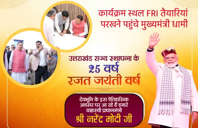 मुख्यमंत्री पुष्कर सिंह धामी ने शुक्रवार को फॉरेस्ट रिसर्च इंस्टीट्यूट (एफआरआई) पहुंचकर रजत उत्सव की तैयारियों का स्थलीय निरीक्षण किया। उन्होंने वहां चल रही व्यवस्थाओं और सुरक्षा इंतज़ामों की बारीकी से समीक्षा की और संबंधित विभागों को आवश्यक दिशा-निर्देश दिए।